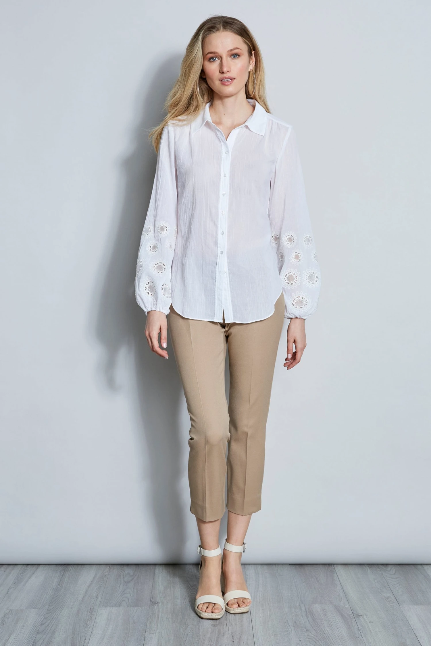 Softly romantic embroidery details the sleeves of summer’s must-have crinkle cotton shirt. We’re obsessed with the texture & movement of this versatile shirt.
