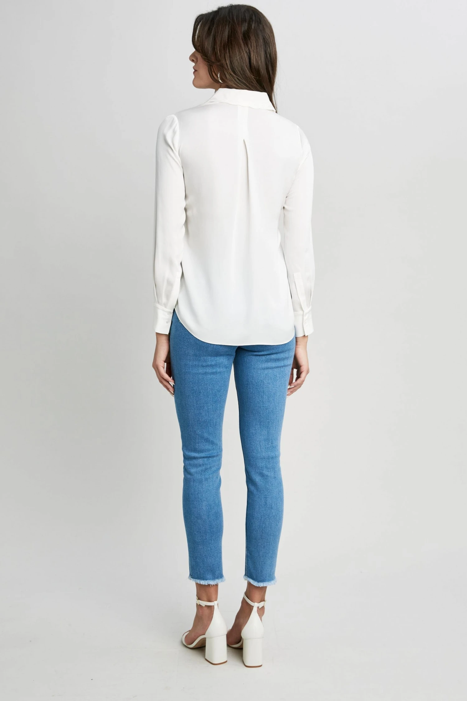 Silk Satin applique embroidery details the collar of our feminine button down shirt in Luxe Silk Georgette.