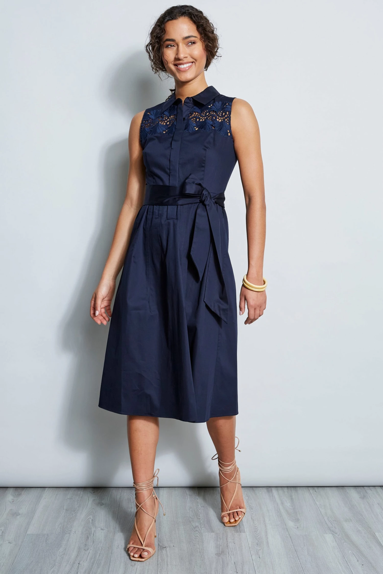 Our favorite stretch Cotton Poplin has the Luxe Patina we wanted for the season’s must have Shirt-Dress. The unique cut-out embroidery and easy pleat skirt give this dress its designer edge.