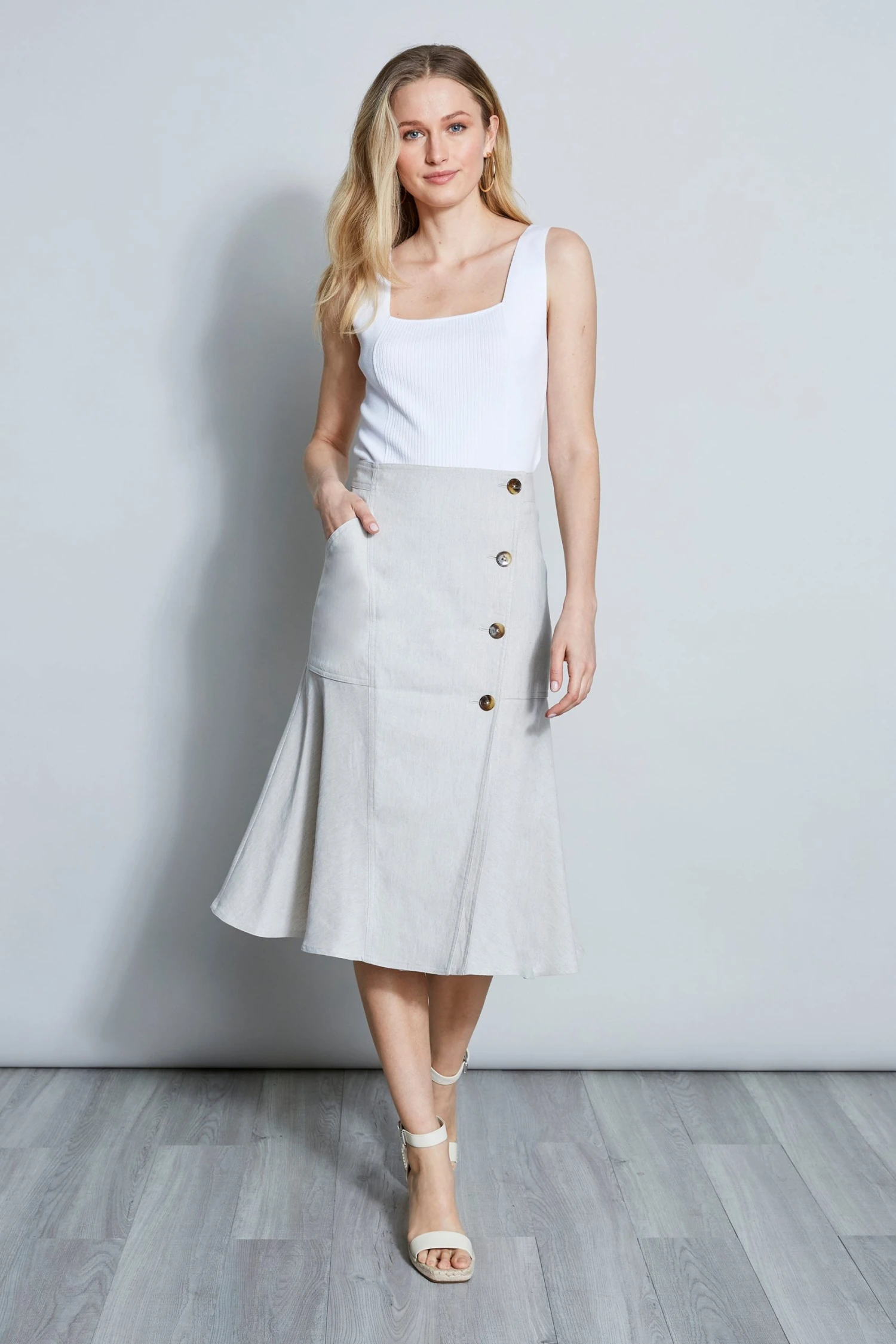 Done in our signature Linen Blend, the Midi skirt gets a modern update with a fit & flare silhouette detailed with buttons.