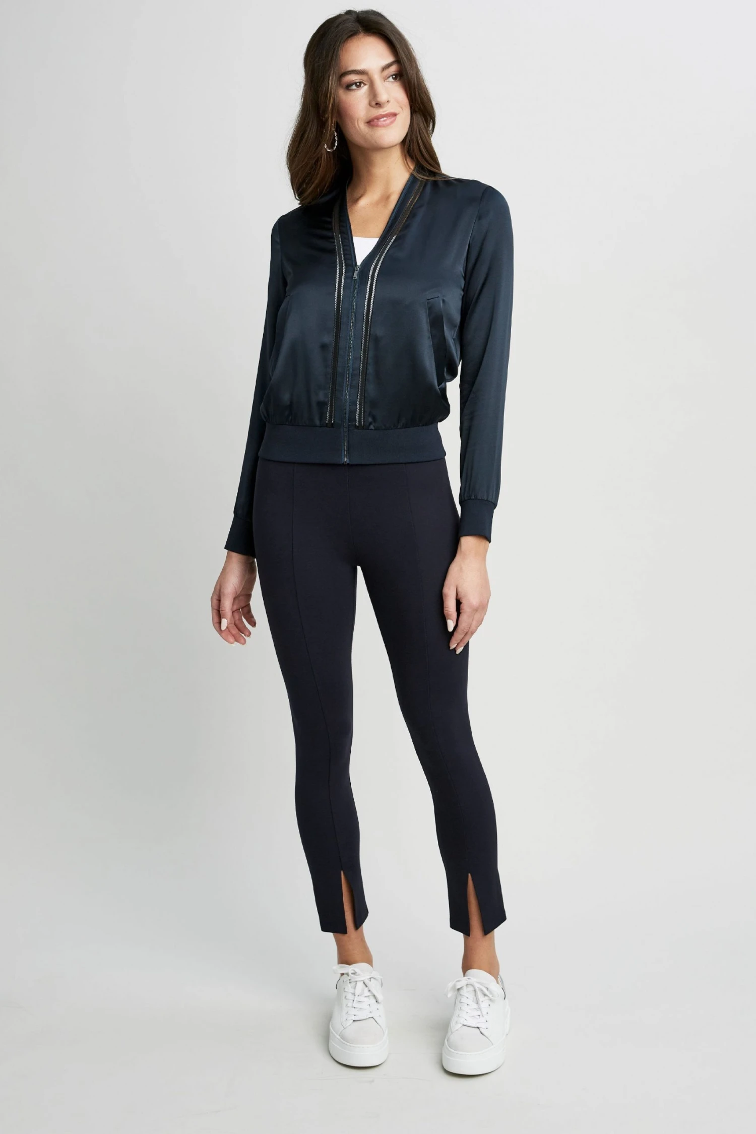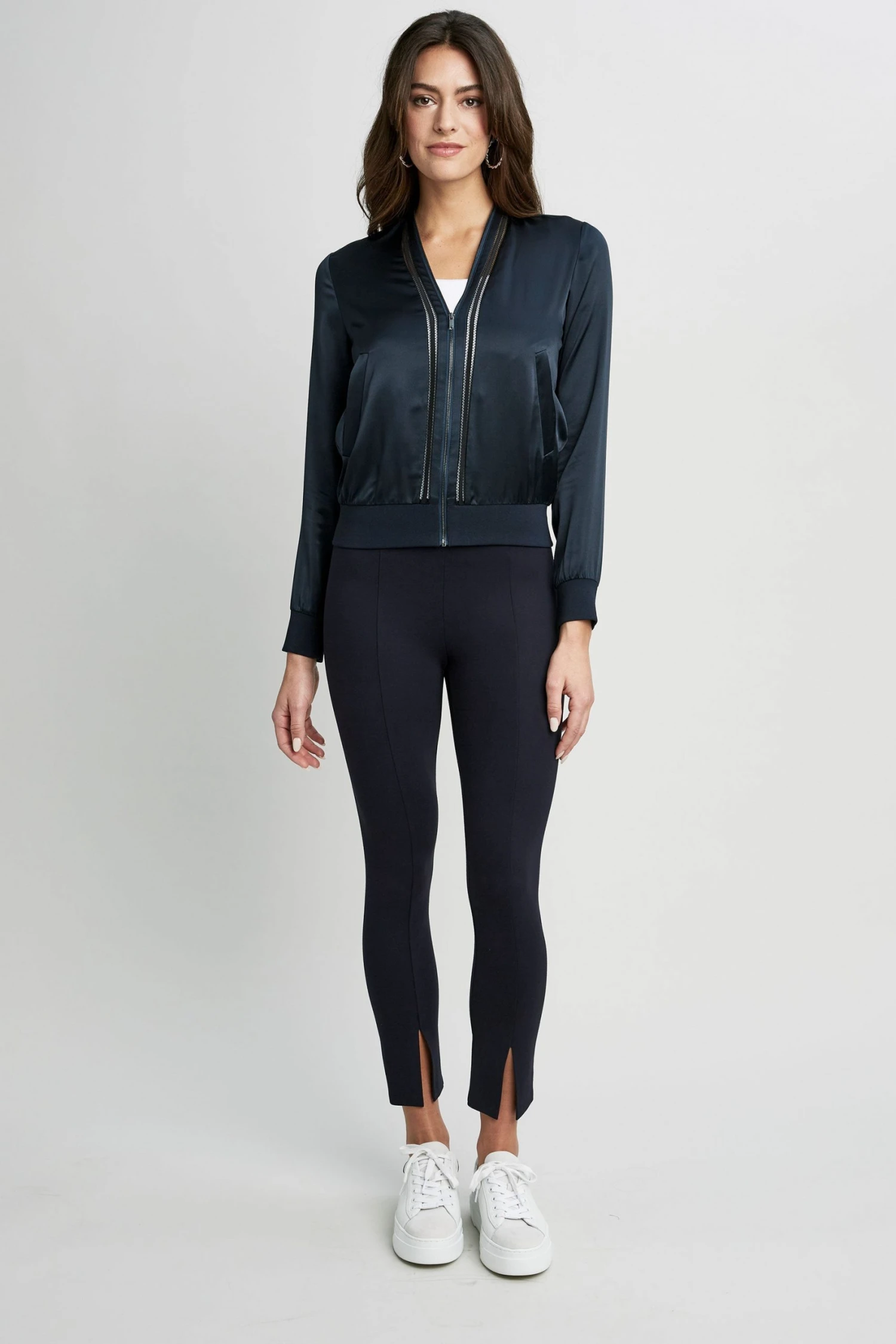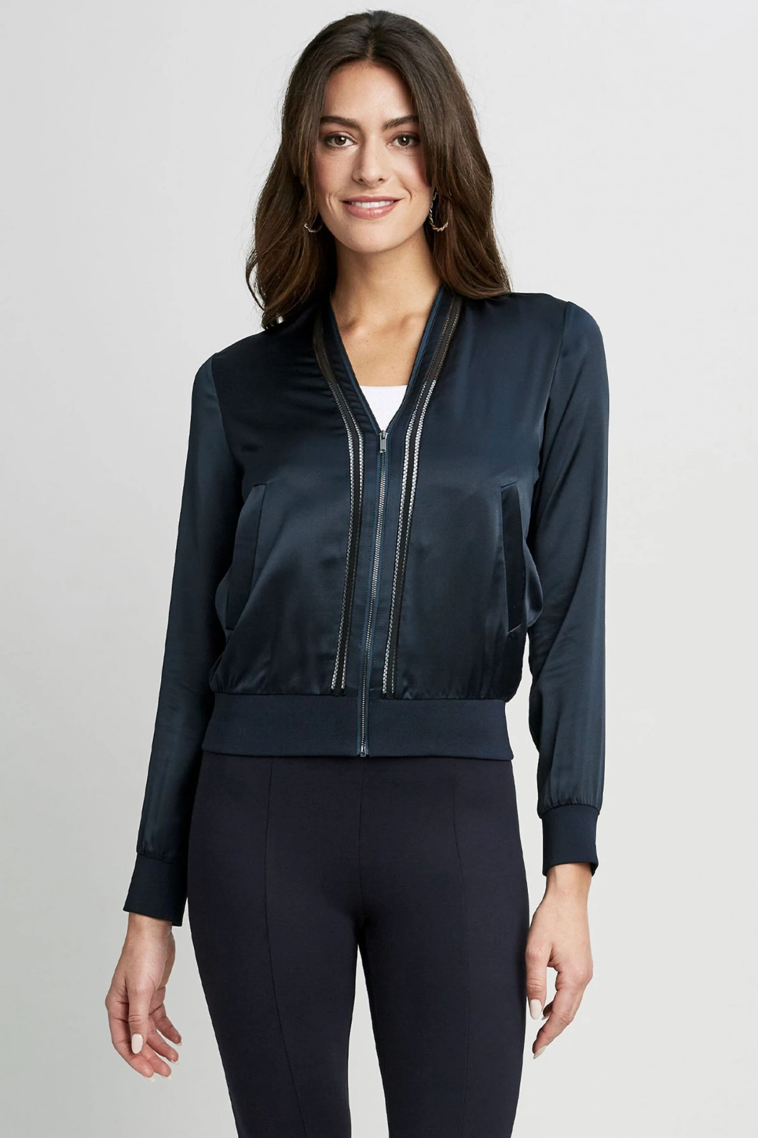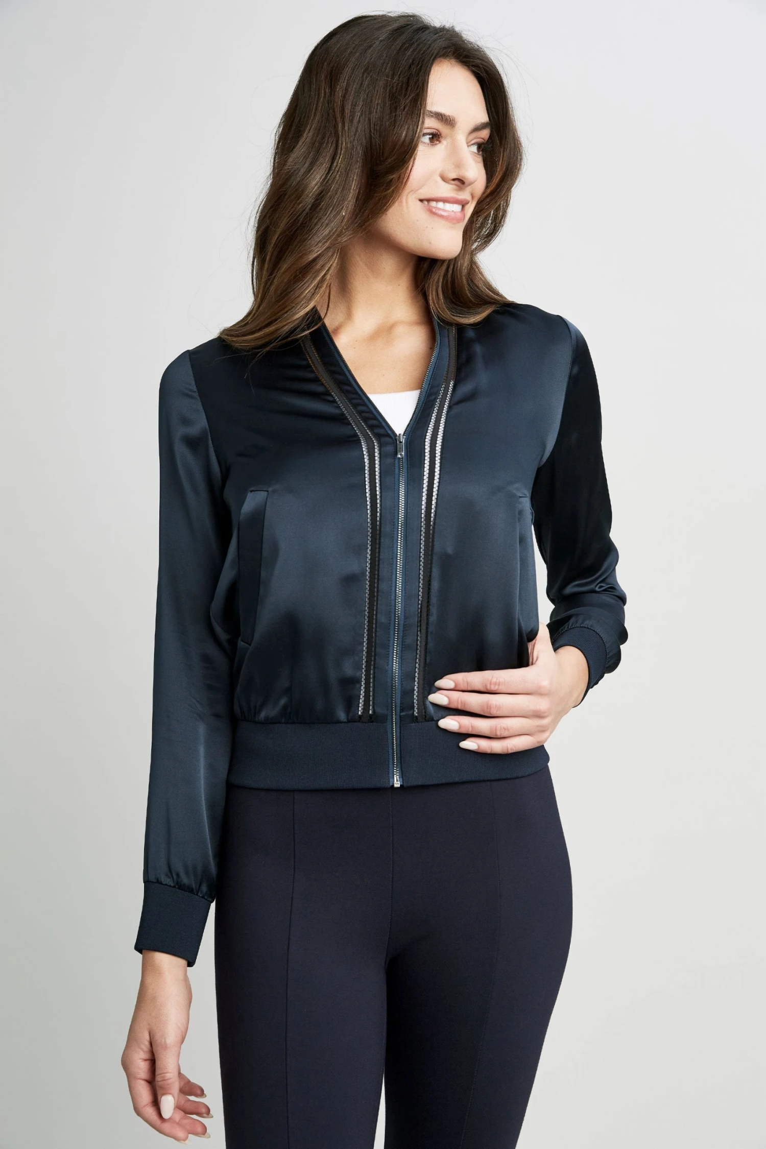 Silk satin takes a sporty detour in this chic bomber. Detailed with a zip front, knit trim & decorative embroidery stitching along the zip closure – dress it up or down with denim or vegan leather.