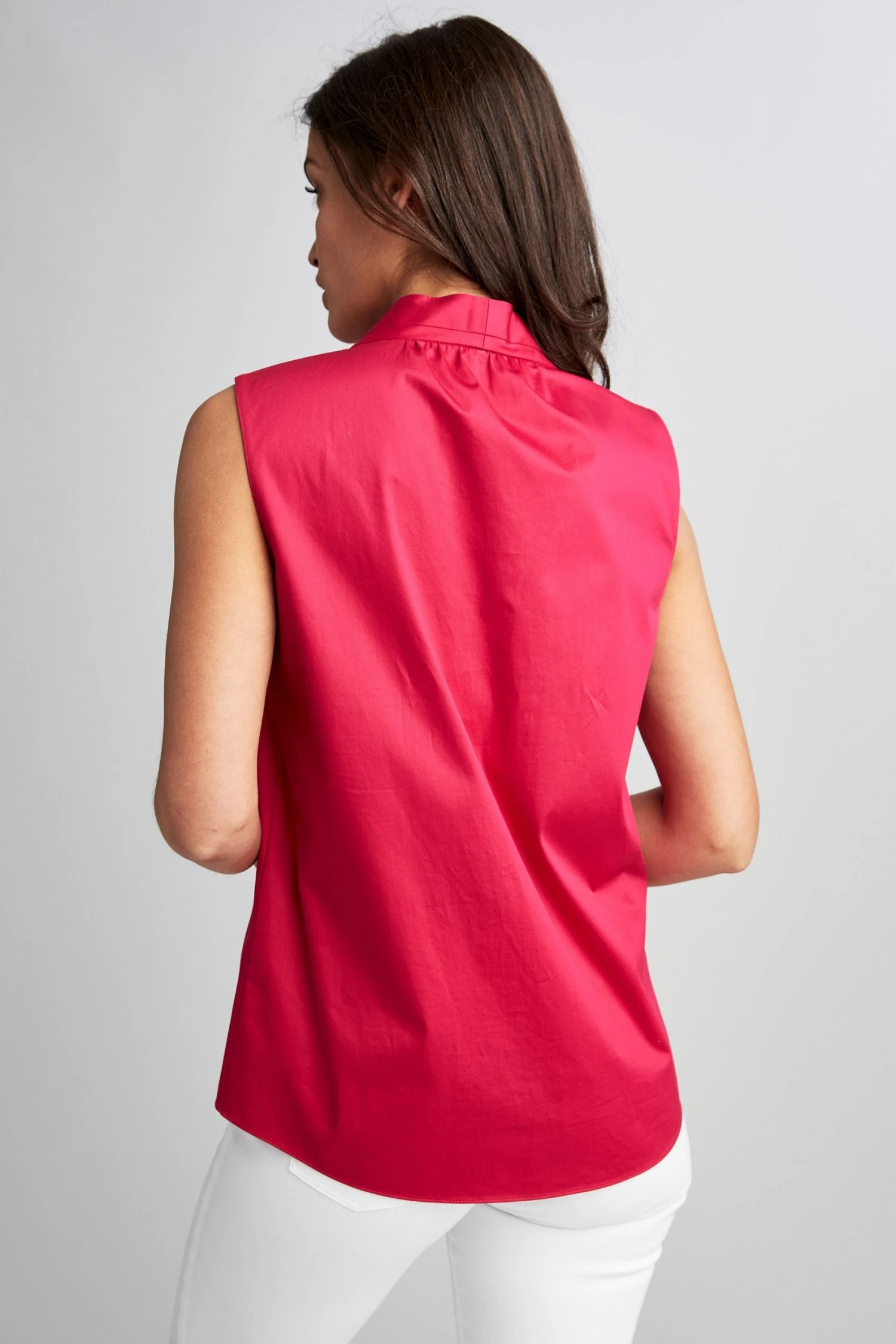 - Sleeveless, pleated shoulder Cotton top with stand collar and split neckline