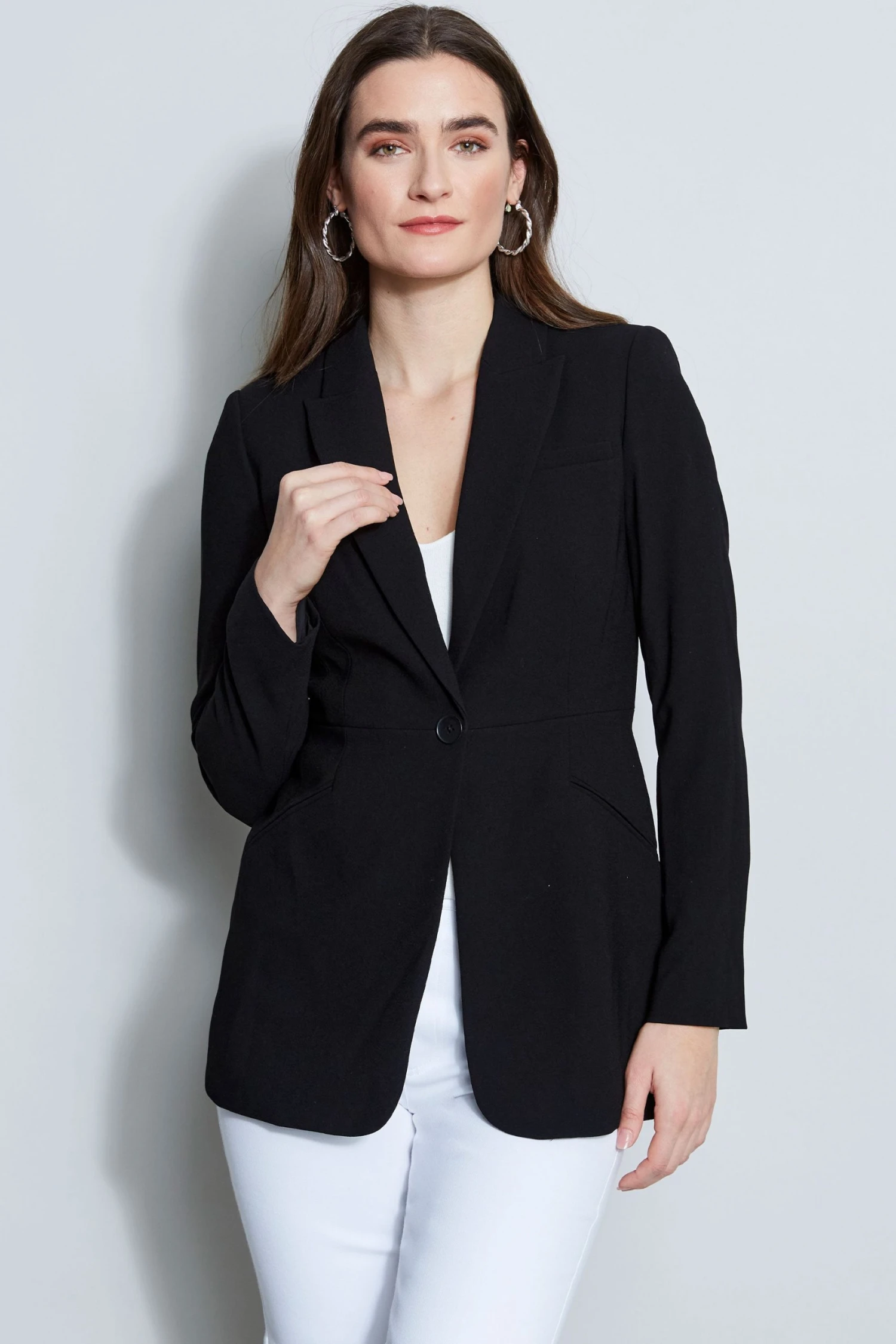 Elie’s signature fitted blazer is slim, polished and modern. Single breasted with peaked lapels with an impeccable cut, it has the cool factor you are looking for in your new favorite blazer.
