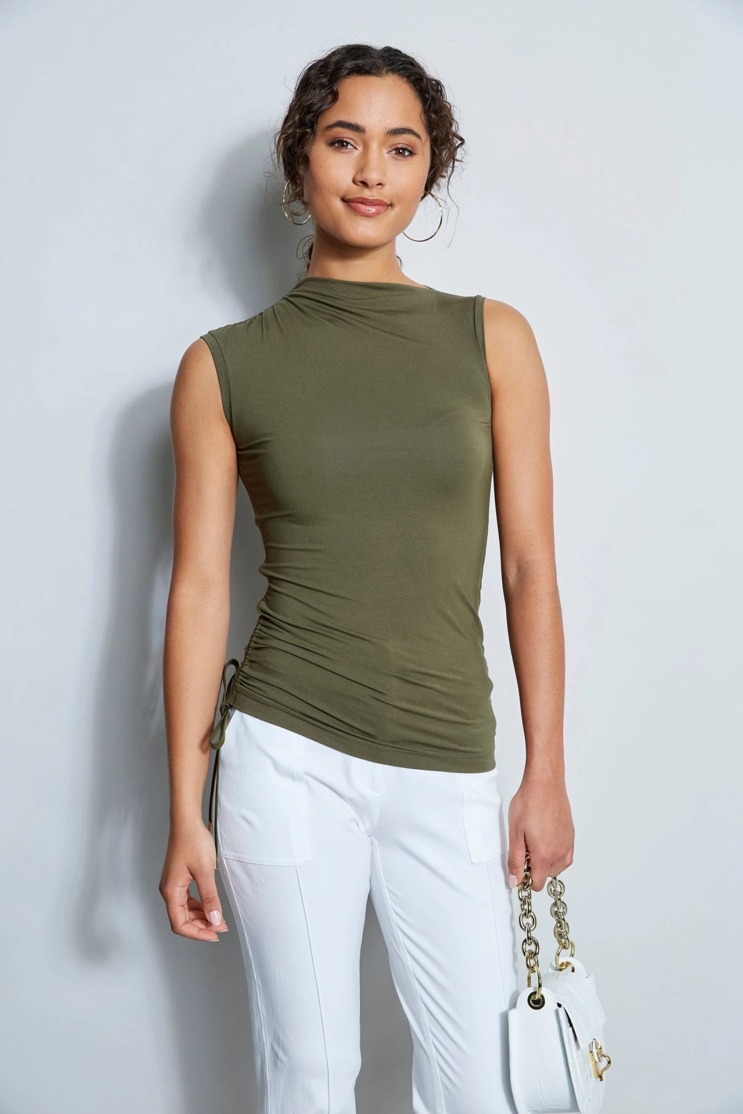 A knit with the cool factor. The modern drawstring side ruching & subtle asymmetric pleat neckline give artistic expression to our Luxe Viscose Stretch Jersey. Dress it down with Jeans or up with Elie’s matching Midi Skirt.Â