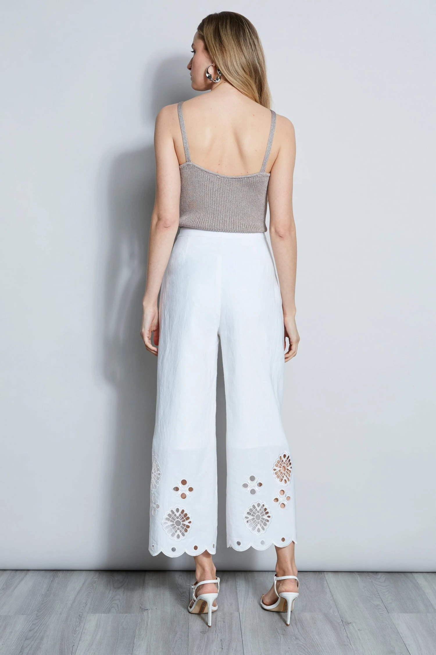- Linen Wide Leg, High Rise, Cropped Pant with Embroidered Scallop Hem
