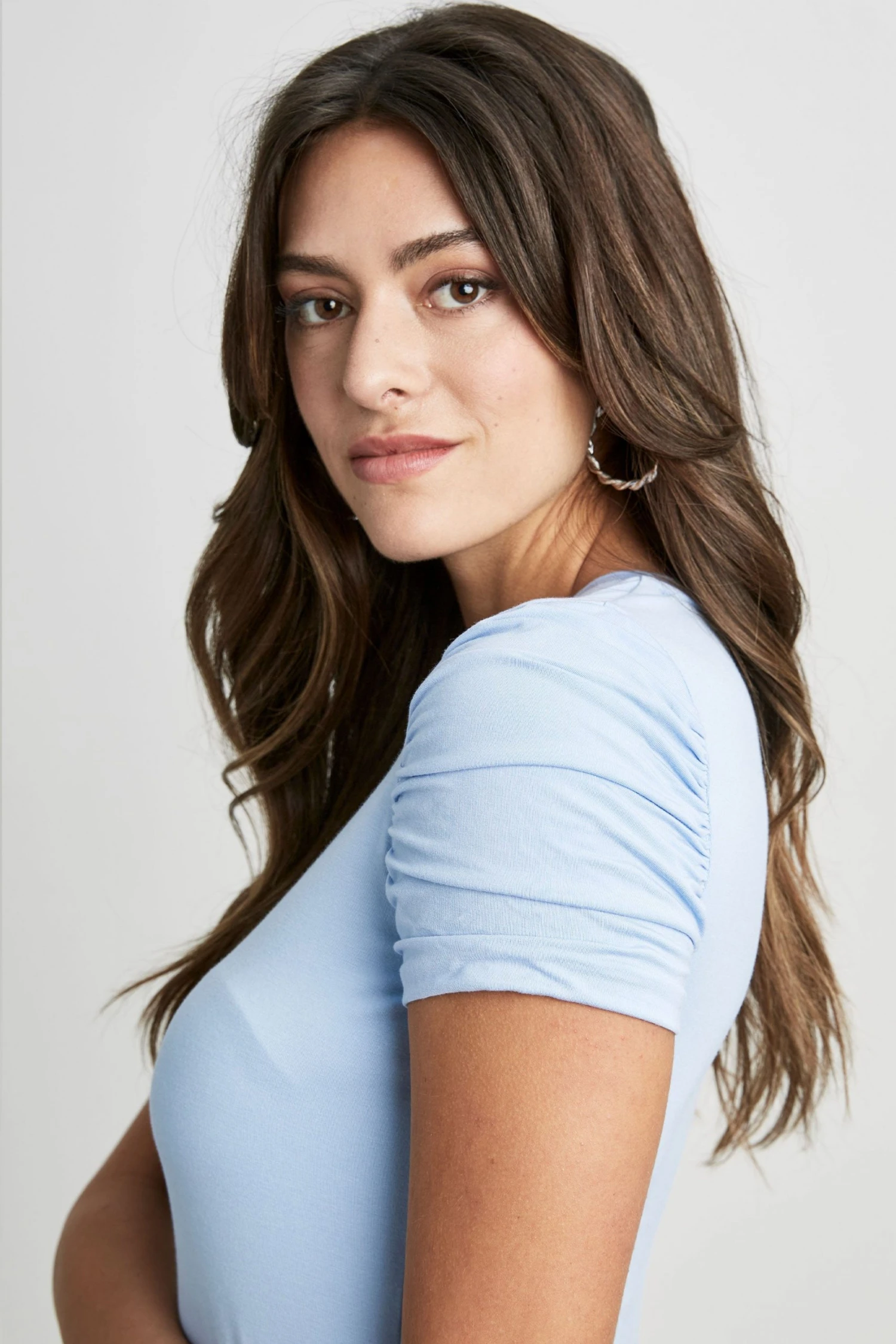 - Short Sleeve Crewneck Jersey Tee with Ruched Puff Sleeves