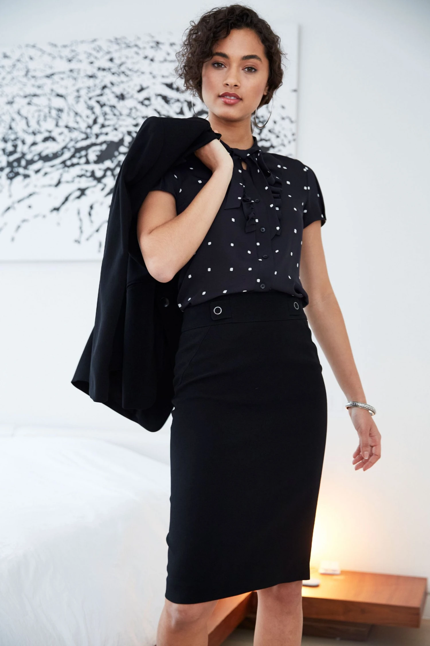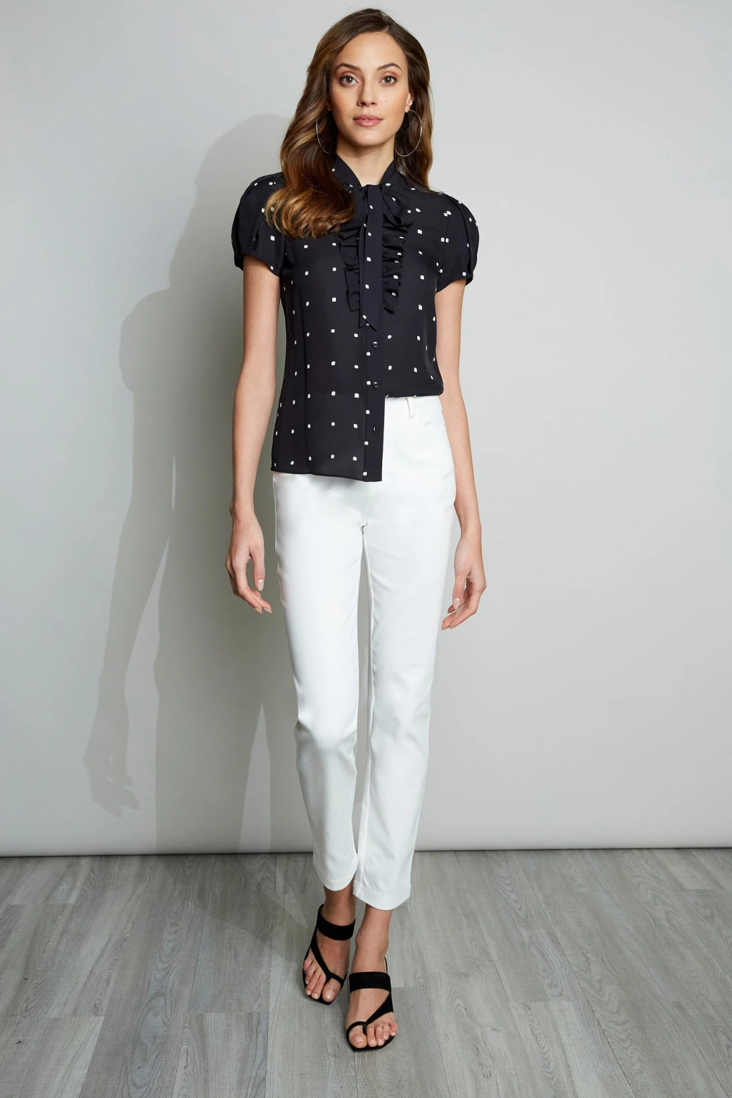- Cube Dot Print Silk Short Sleeve Shirt with Ruffle Detail & Neck Tie