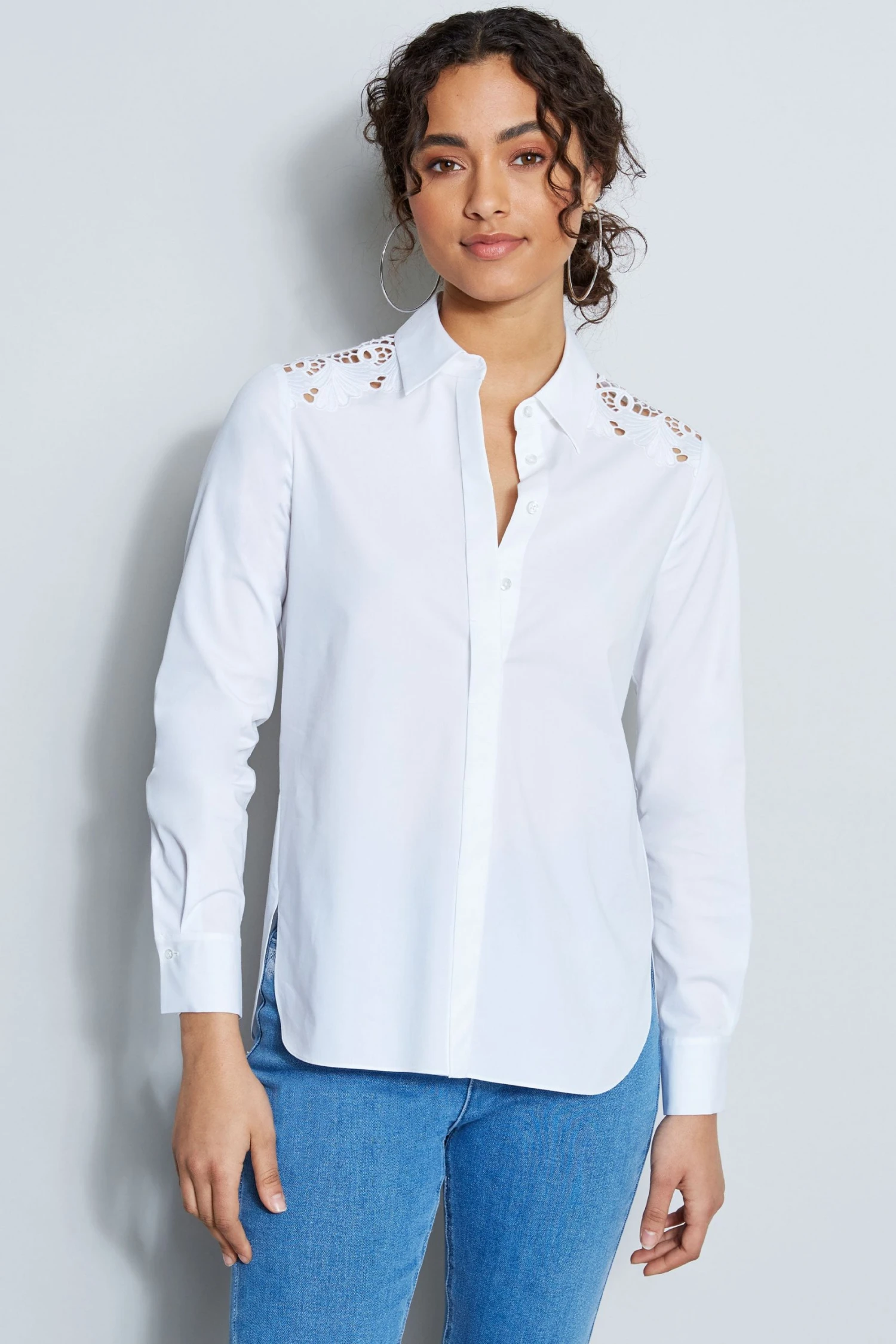 - Stretch Cotton Button Down with Embroidered Lace Shoulder Detail