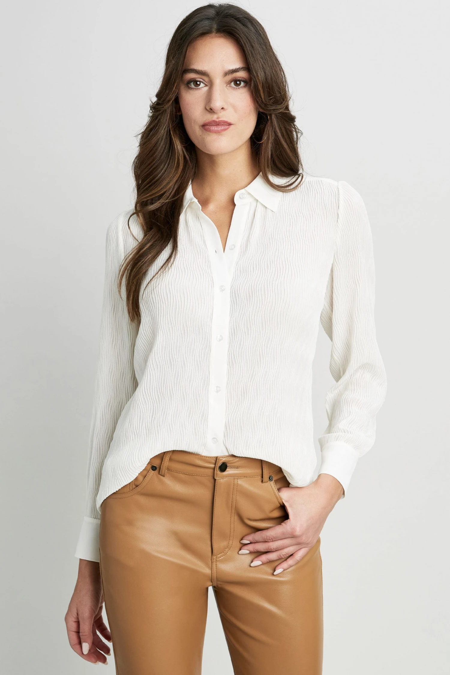 Add texture to your wardrobe with our chic Long Sleeve Pleated Shirt. Featuring an artistic wave pleating design, our button down shirt is detailed with solid Georgette collar, placket & cuffs. We’re obsessed with the texture & movement of this versatile shirt.