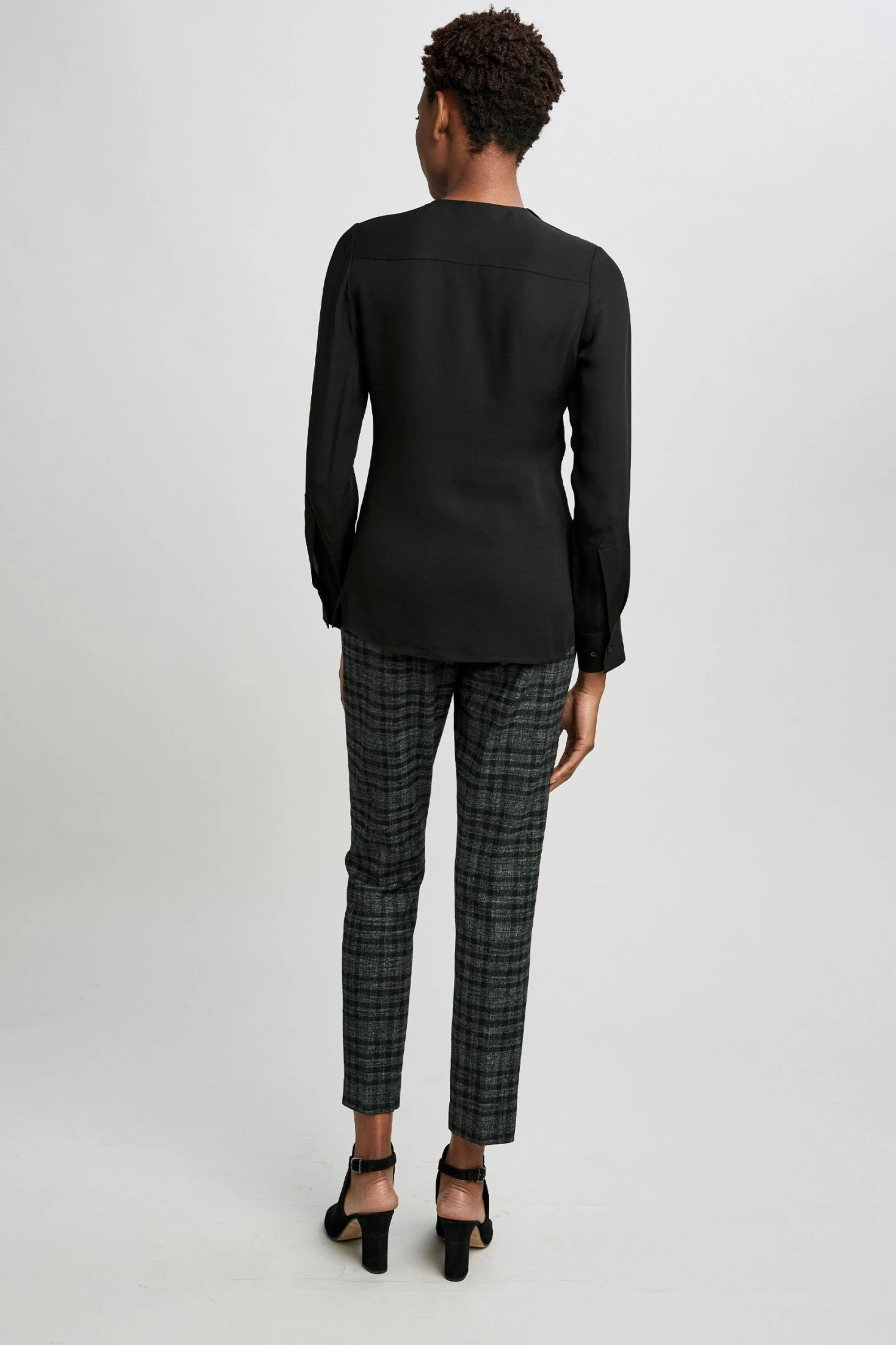 - Long Sleeve V-Neck Origami Panel Silk Shirt.