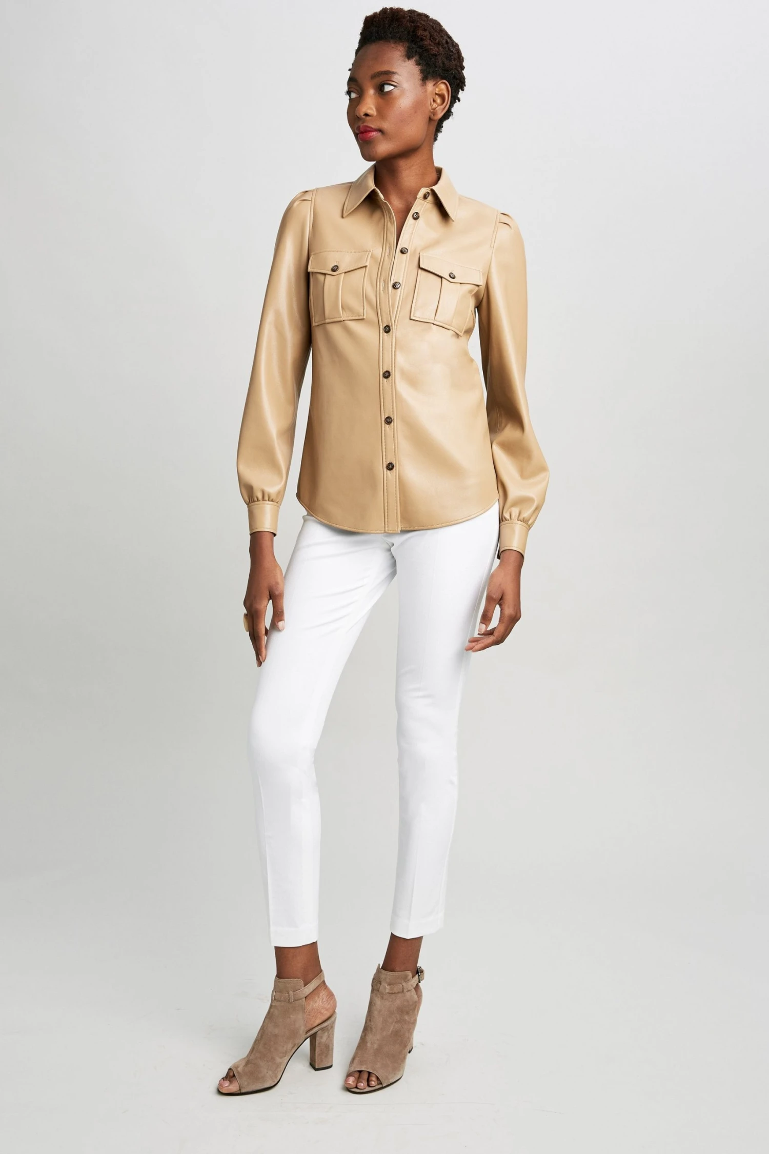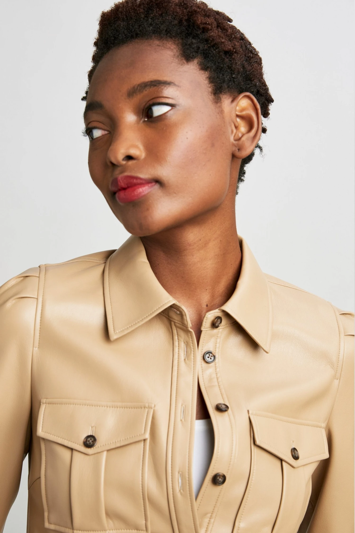 Is it a Shirt Is it a Jacket It’s our favorite layering piece for Fall. Our Vegan Leather Shacket feels like butter, but wears like leather. Versatile & edgy, this Shacket will instantly update your Fall Wardrobe.