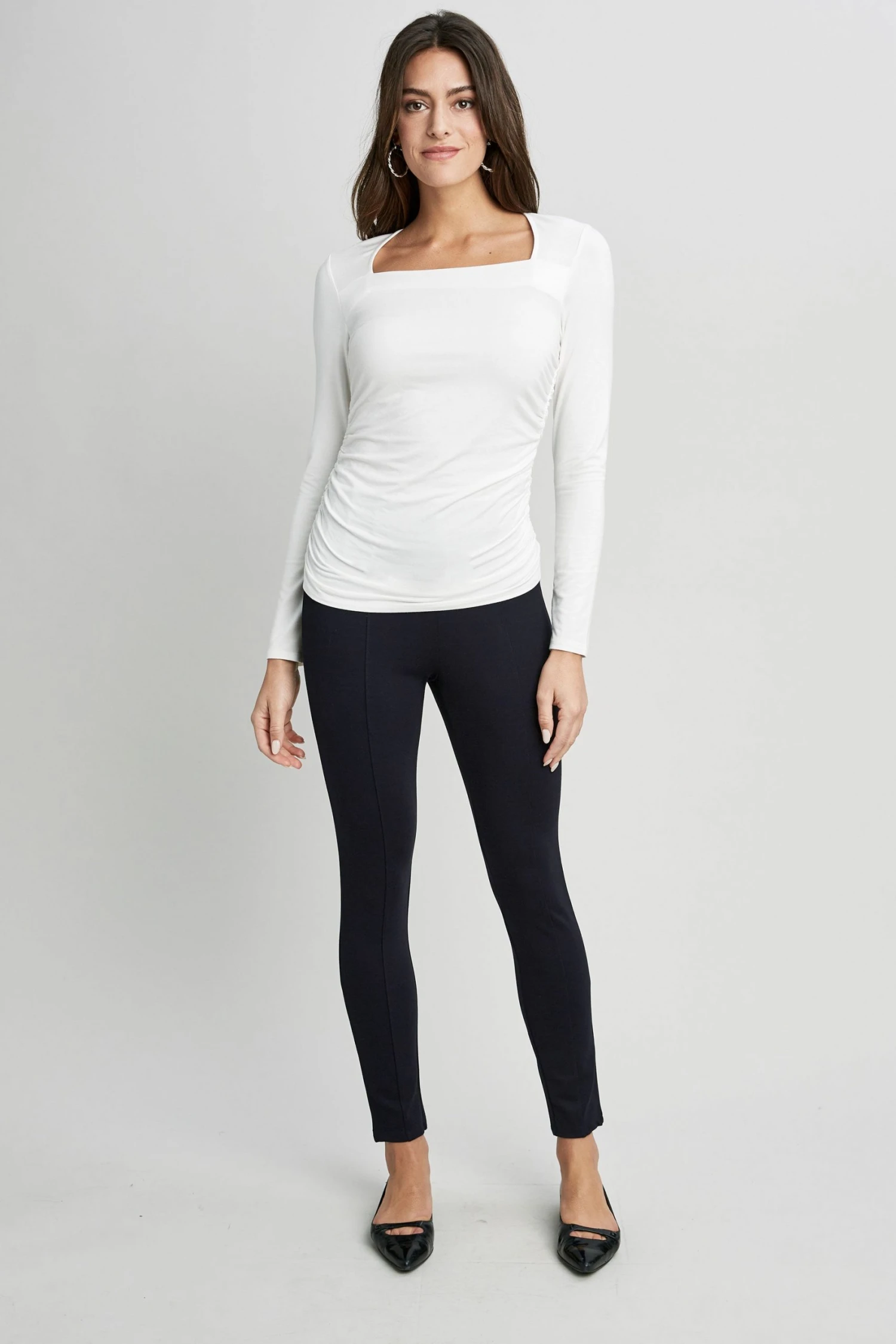 We’re all about this square neckline. Fitted in all the right places – the modern neckline, long sleeves & ruching along the side seams make this the must-have layering piece of the season. The body skimming shape of this Stretch Viscose knit makes it perfect for layering under your favorite blazer or wearing it on its own.
